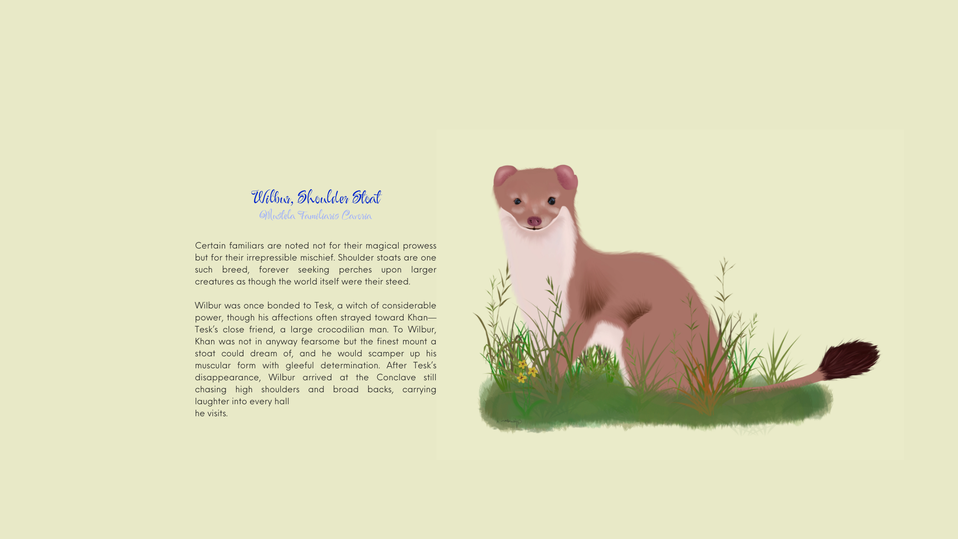 One by one, the familiars stir—twitching whiskers, fluttering wings, soft tails curling from around tiny paws. A bunny with starlit fur stretches her ears toward the warmth. A fox with a leaf strewn antler crown yawns wide, the glow of long-forgotten spells flickering faintly in her breath. A stoat rolls sleepily from a bed of clover, still tangled in dreams of spellcasters past.