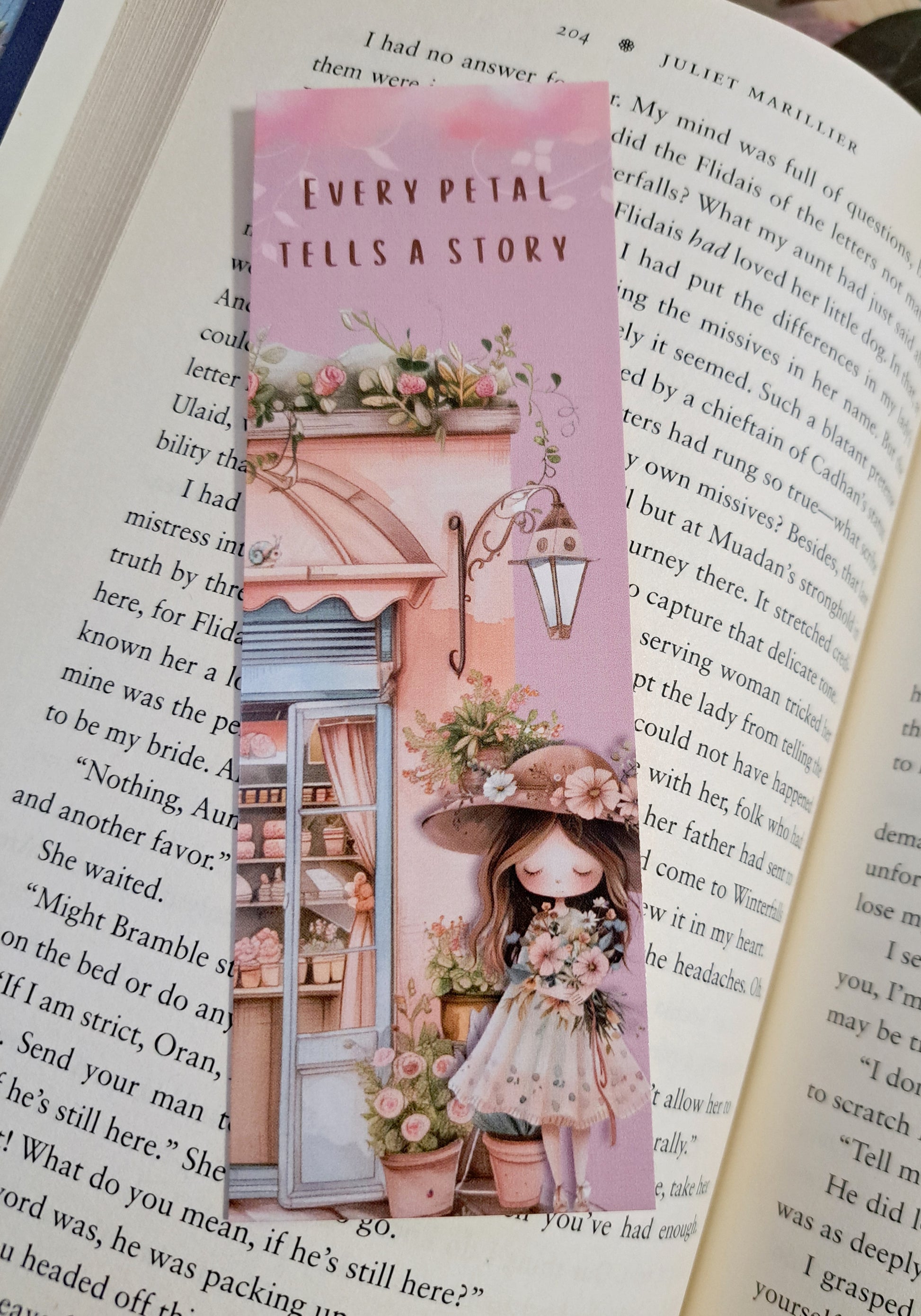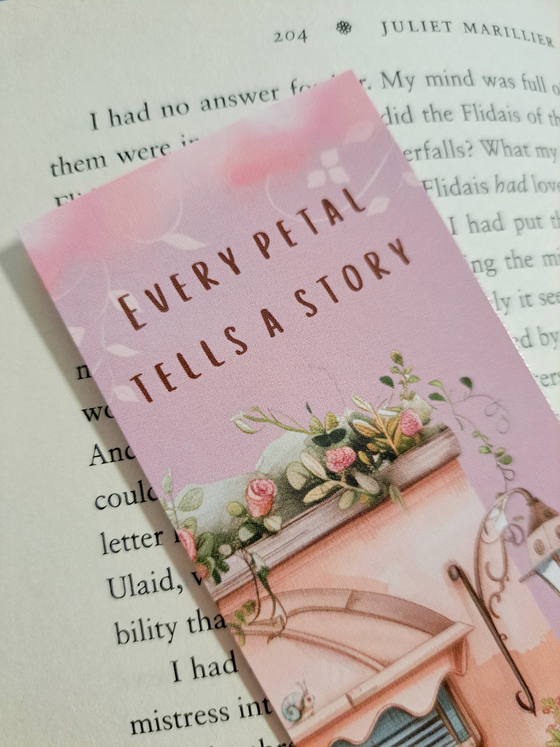 The heartfelt message "Every Petal Tells a Story" printed on the front adds a touch of charm and serves to tie the flower theme of the bookmark to the idea that everything has it's own story to tell, even flowers.