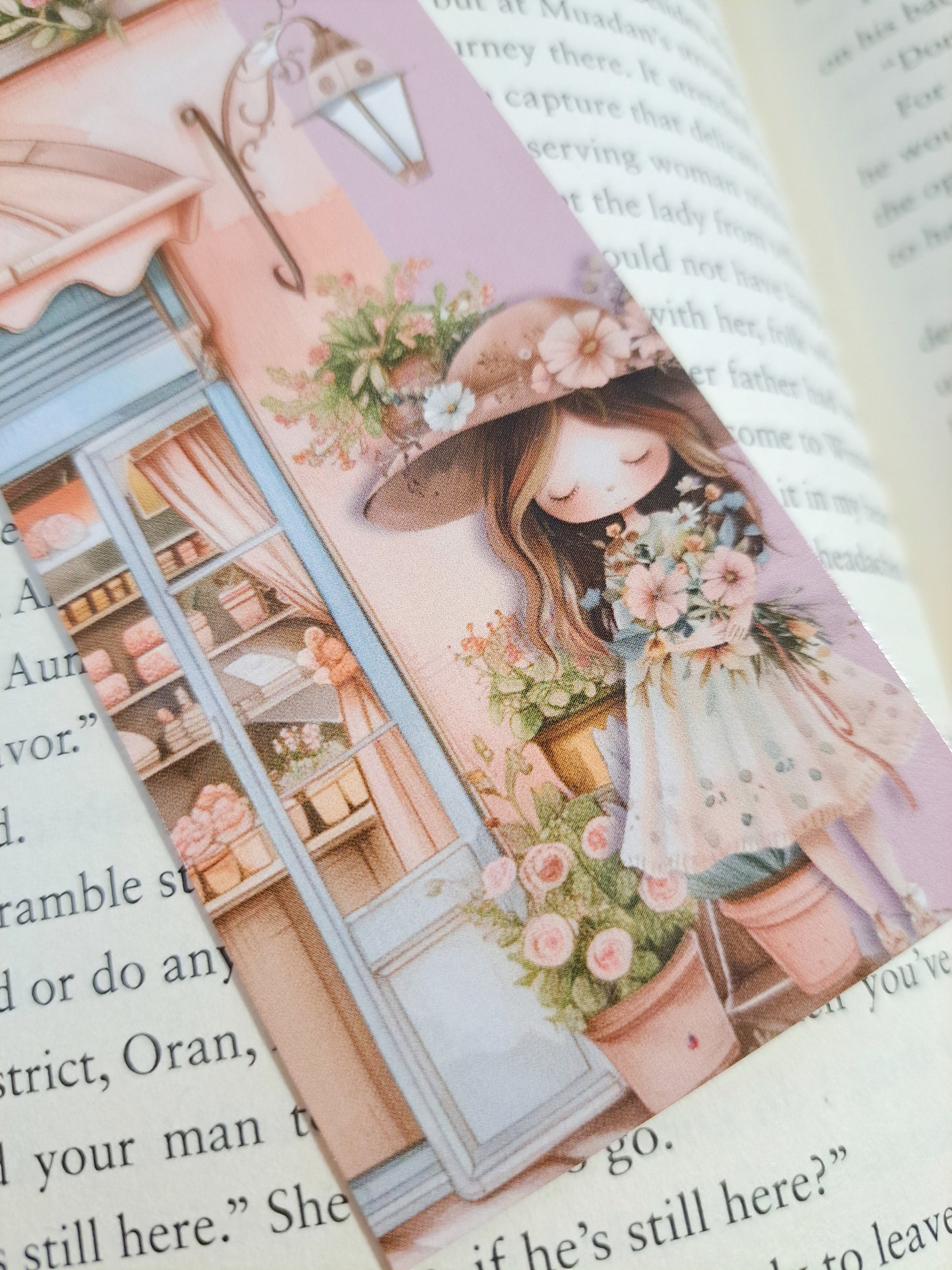 Adorned with a cute pink flower shop with it's potted plants displayed outside and the image of a girl in a sunhat who appears to have been flower shopping, this bookmark hosts a whimsical and idyllic scene.