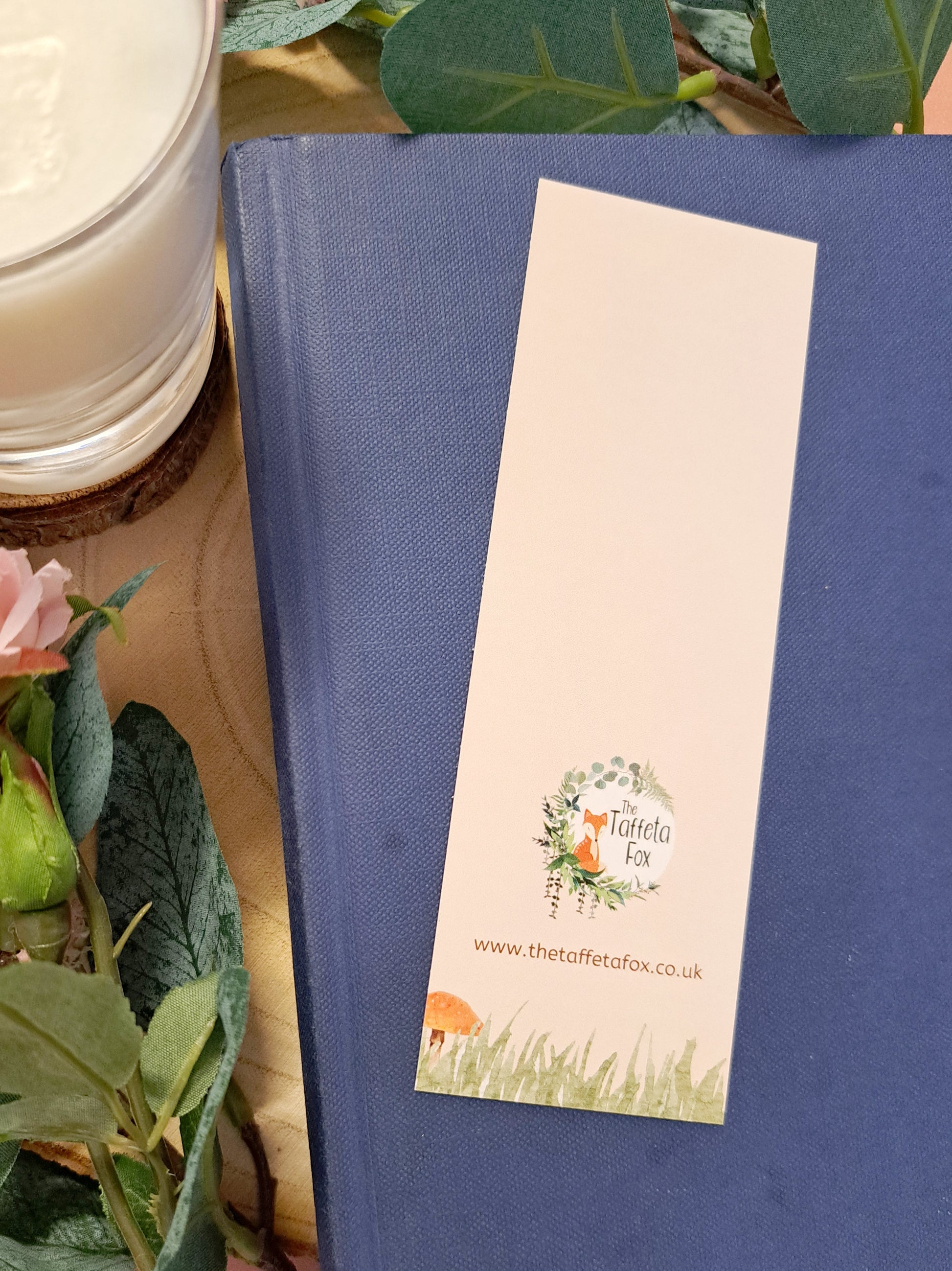 The back of the bookmark keeps the theme going with our signature grass and a little toadstool growing on the left hand side. It also features The Taffeta Fox logo and website address so you won't forget to visit us and treat yourself or your loved ones more goodies.